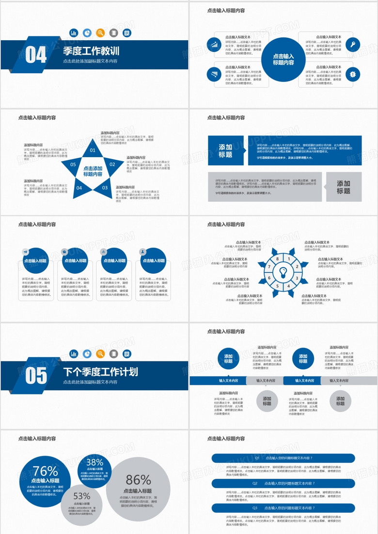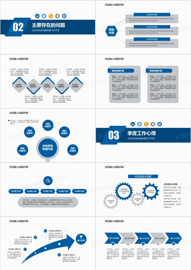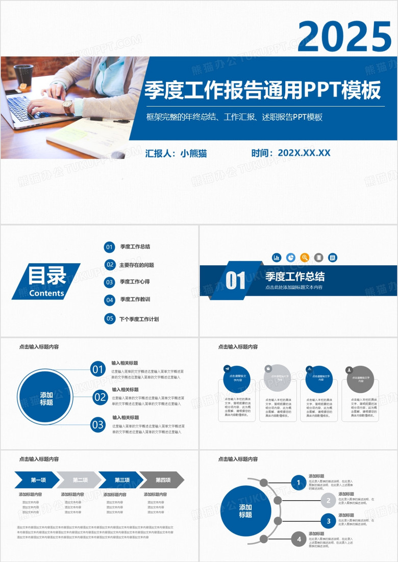 本作品内容为2025蓝色简约商务风季度工作总结报告通用PPT模板, 格式为 pptx, 大小8 MB, 页数为30,比例16:9, 请使用软件PowerPoint(2016)打开, 作品中主体文字及图片可替换修改,文字修改可直接点击文本框进行编辑,图片更改可选中图片后单击鼠标右键选择更换图片,也可根据自身需求增加和删除作品中的内容, 源文件无水印。 如认为平台内容涉嫌侵权,可通过邮件提出书面通知,我们将及时处理。