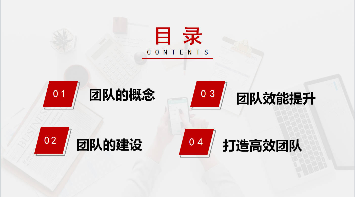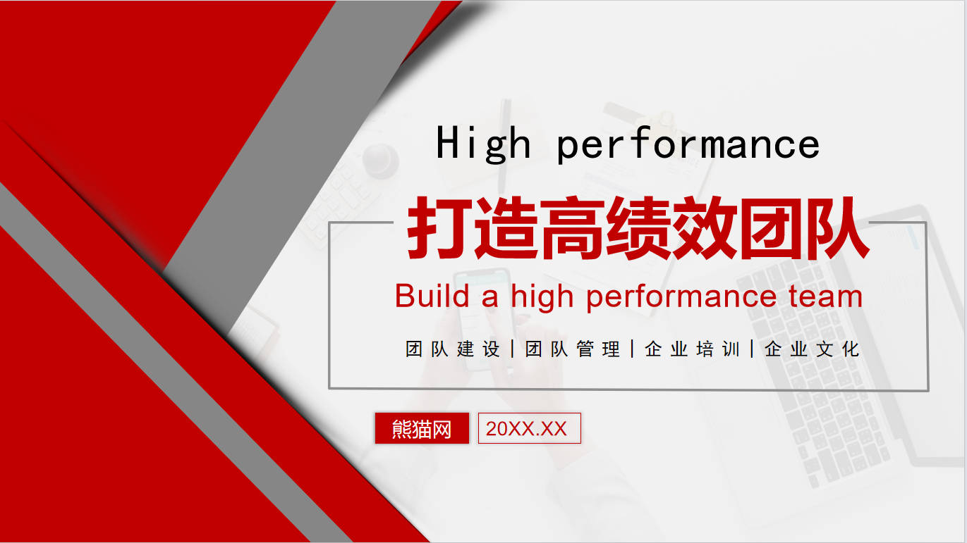 本作品内容为红色简约风打造高绩效团队培训PPT模板, 格式为 pptx, 大小10 MB, 页数为50,比例16:9, 请使用软件PowerPoint(2019)打开, 作品中主体文字及图片可替换修改,文字修改可直接点击文本框进行编辑,图片更改可选中图片后单击鼠标右键选择更换图片,也可根据自身需求增加和删除作品中的内容, 源文件无水印, 欢迎使用。 如认为平台内容涉嫌侵权,可通过邮件提出书面通知,我们将及时处理。