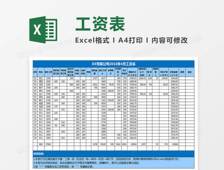 本作品内容为工资表管理自动计算和扣税自动生成工资条模板, 格式为 xlsx, 大小1 MB, 请使用软件Excel(2016)打开, 作品中主体文字及图片可替换修改,文字修改可直接点击文本框进行编辑,图片更改可选中图片后单击鼠标右键选择更换图片,也可根据自身需求增加和删除作品中的内容, 源文件无水印, 欢迎使用。 如认为平台内容涉嫌侵权,可通过邮件提出书面通知,我们将及时处理。