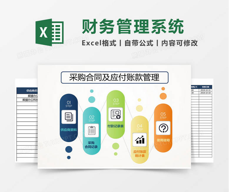 本作品内容为采购合同及应付账款管理系统excel表格, 格式为 xlsx, 大小1 MB, 请使用软件Excel(2016)打开, 作品中主体文字及图片可替换修改,文字修改可直接点击文本框进行编辑,图片更改可选中图片后单击鼠标右键选择更换图片,也可根据自身需求增加和删除作品中的内容, 源文件无水印, 欢迎使用。 如认为平台内容涉嫌侵权,可通过邮件提出书面通知,我们将及时处理。