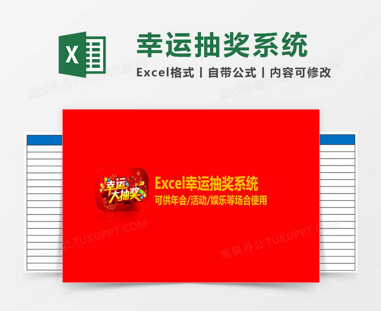 本作品内容为按F9幸运抽奖系统excel模板, 格式为 xlsx, 大小1 MB, 请使用软件Excel(2016)打开, 作品中主体文字及图片可替换修改,文字修改可直接点击文本框进行编辑,图片更改可选中图片后单击鼠标右键选择更换图片,也可根据自身需求增加和删除作品中的内容, 源文件无水印, 欢迎使用。 如认为平台内容涉嫌侵权,可通过邮件提出书面通知,我们将及时处理。