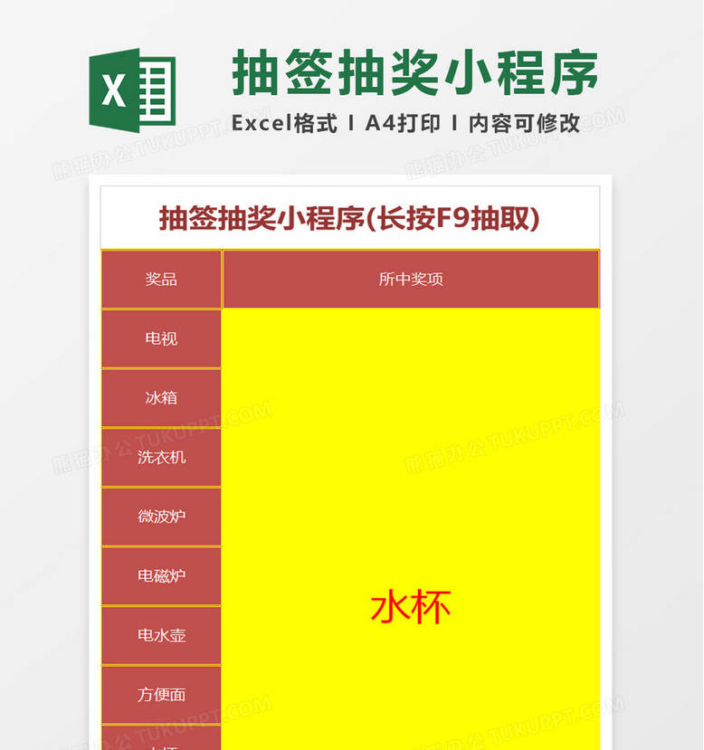 本作品内容为抽签抽奖小程序, 格式为 xlsx, 大小1 MB, 请使用软件Excel(2016)打开, 作品中主体文字及图片可替换修改,文字修改可直接点击文本框进行编辑,图片更改可选中图片后单击鼠标右键选择更换图片,也可根据自身需求增加和删除作品中的内容, 源文件无水印, 欢迎使用。 如认为平台内容涉嫌侵权,可通过邮件提出书面通知,我们将及时处理。