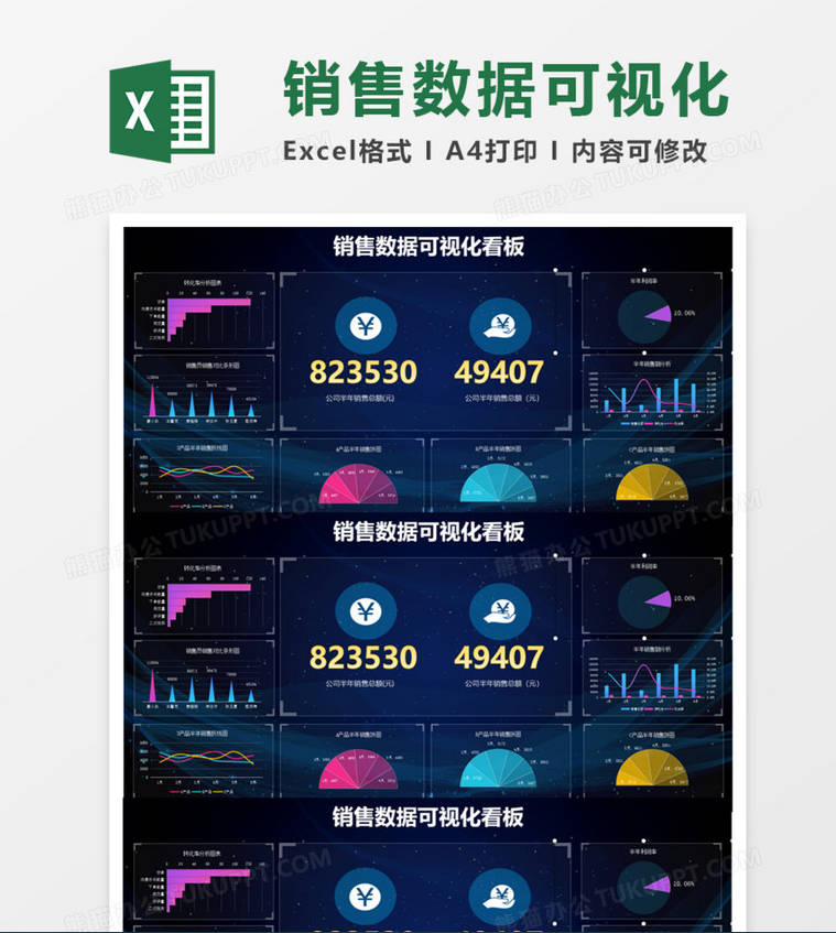 本作品内容为销售数据可视化看板Execl模板, 格式为 xlsx, 大小3 MB, 请使用软件Excel(2016)打开, 作品中主体文字及图片可替换修改,文字修改可直接点击文本框进行编辑,图片更改可选中图片后单击鼠标右键选择更换图片,也可根据自身需求增加和删除作品中的内容, 源文件无水印, 欢迎使用。 如认为平台内容涉嫌侵权,可通过邮件提出书面通知,我们将及时处理。