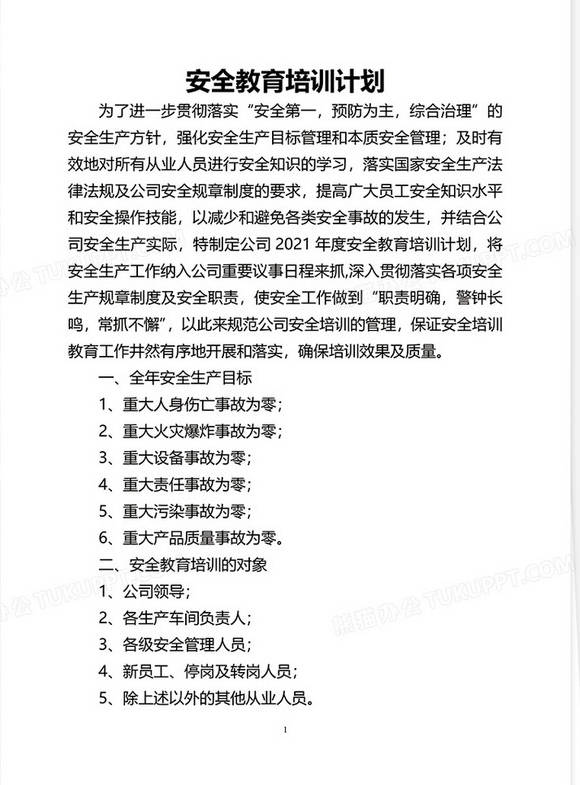 本作品内容为企业安全教育培训计划word模板, 格式为 docx, 大小1 MB, 页数为7, 请使用软件Word(2019)打开, 作品中主体文字及图片可替换修改,文字修改可直接点击文本框进行编辑,图片更改可选中图片后单击鼠标右键选择更换图片,也可根据自身需求增加和删除作品中的内容, 源文件无水印, 欢迎使用。 如认为平台内容涉嫌侵权,可通过邮件提出书面通知,我们将及时处理。