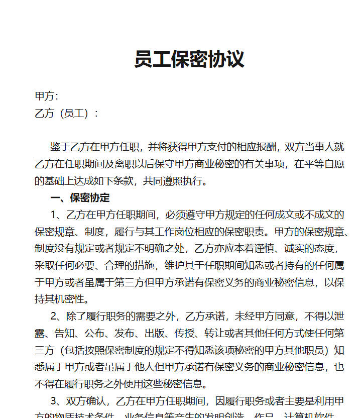 本作品内容为简洁实用员工保密协议Word模版, 格式为 docx, 大小1 MB, 页数为4, 请使用软件Word(2019)打开, 作品中主体文字及图片可替换修改,文字修改可直接点击文本框进行编辑,图片更改可选中图片后单击鼠标右键选择更换图片,也可根据自身需求增加和删除作品中的内容, 源文件无水印, 欢迎使用熊猫办公。 如认为平台内容涉嫌侵权,可通过邮件:tousu@tukuppt.com提出书面通知,我们将及时处理。